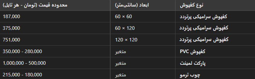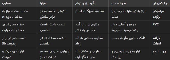 ✅ انتخابهای مناسب: پارکت لمینت، کفپوش وینیل، سرامیک، موکت، کفپوش پشت چسبدار